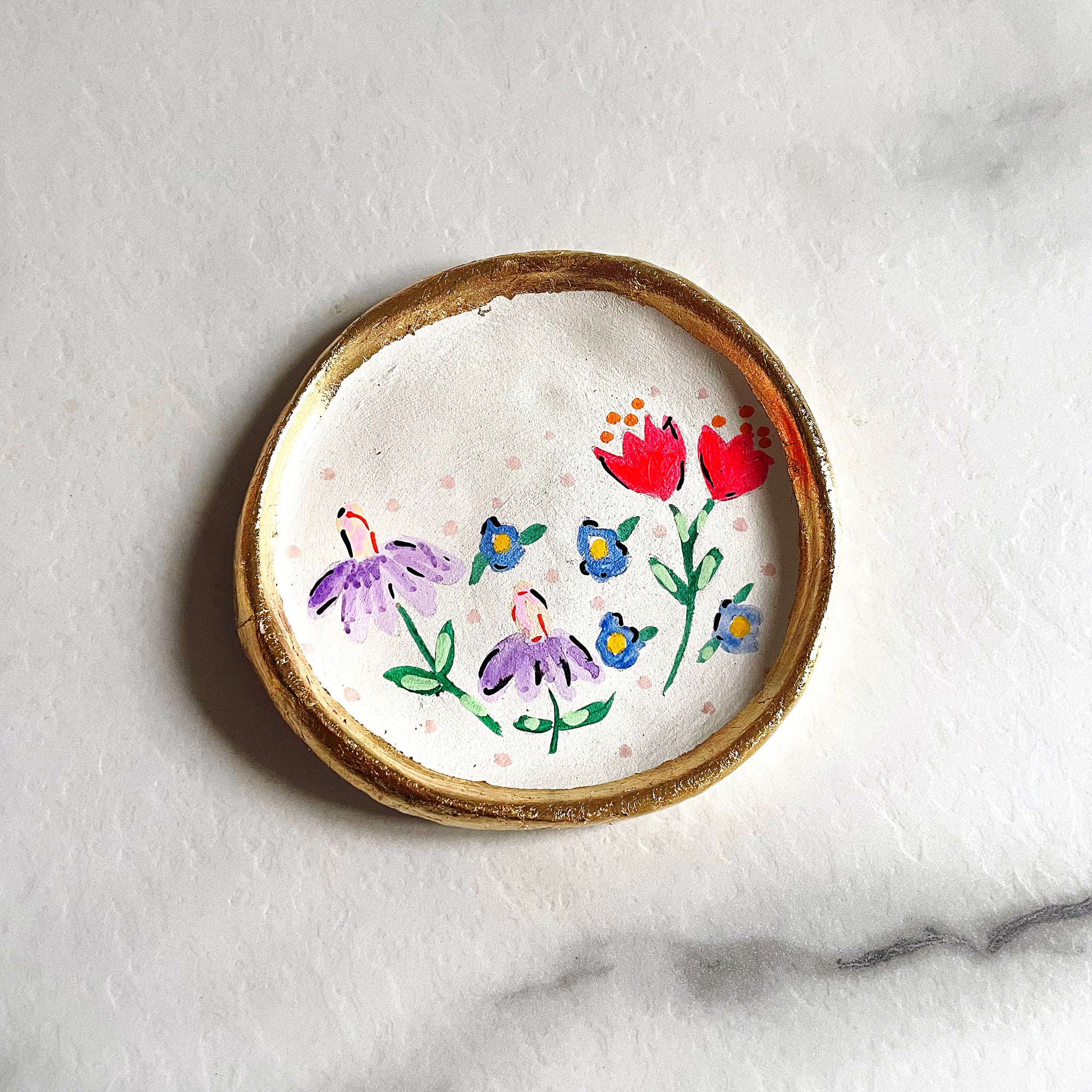 A hand made clay trinket dish hand painted by Gem complete with real 23.75 carat gold leaf trim.